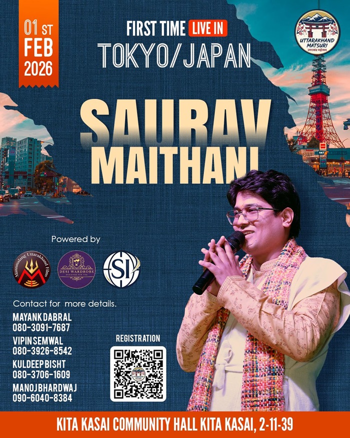 रुद्रप्रयाग, 28 जनवरी 2026: उत्तराखंड की समृद्ध लोक संस्कृति एक बार फिर देश की सीमाओं को पार कर विश्वपटल पर अपनी पहचान बनाने जा रही है। आगामी 01 फरवरी 2026 को टोक्यो, जापान में प्रवासी उत्तराखंडियों द्वारा एक भव्य “उत्तराखंडमात्सुरी” कार्यक्रम का आयोजन किया जा रहा है, जिसमें उत्तराखंड के सुप्रसिद्ध लोकगायक सौरव मैठाणी अपनी सशक्त और भावनात्मक प्रस्तुति से लोकसंस्कृति के रंग बिखेरते नजर आएंगे।